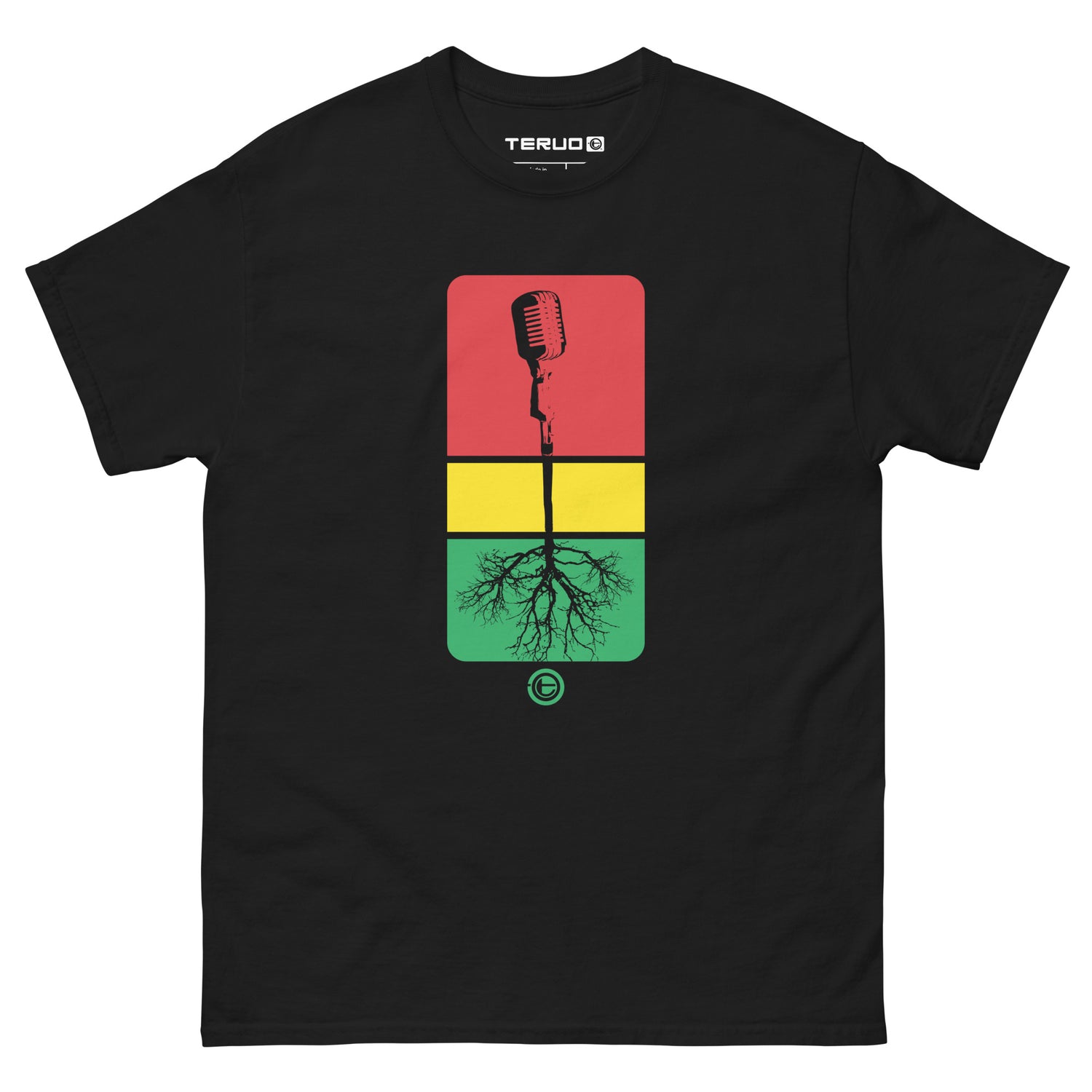 The design that started it all! The often imitated, but never duplicated Mic Roots tee is back! A vintage microphone rises from its roots symbolizing the power and presence of real organic growth.